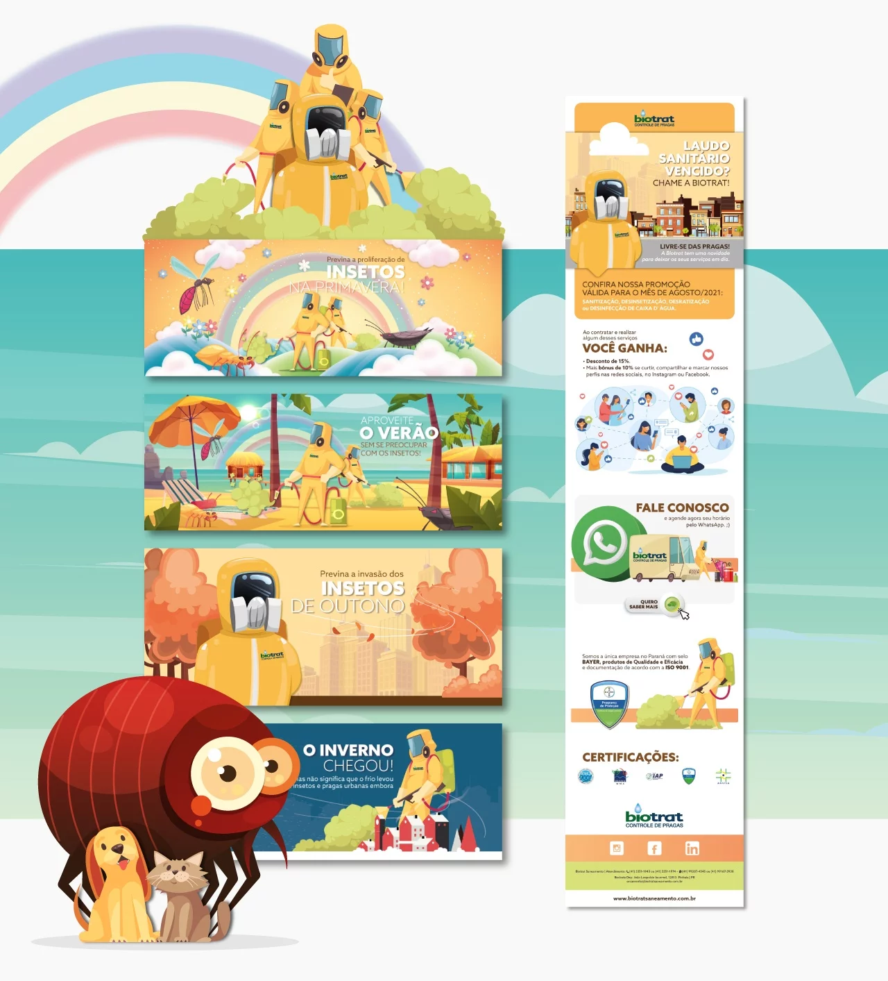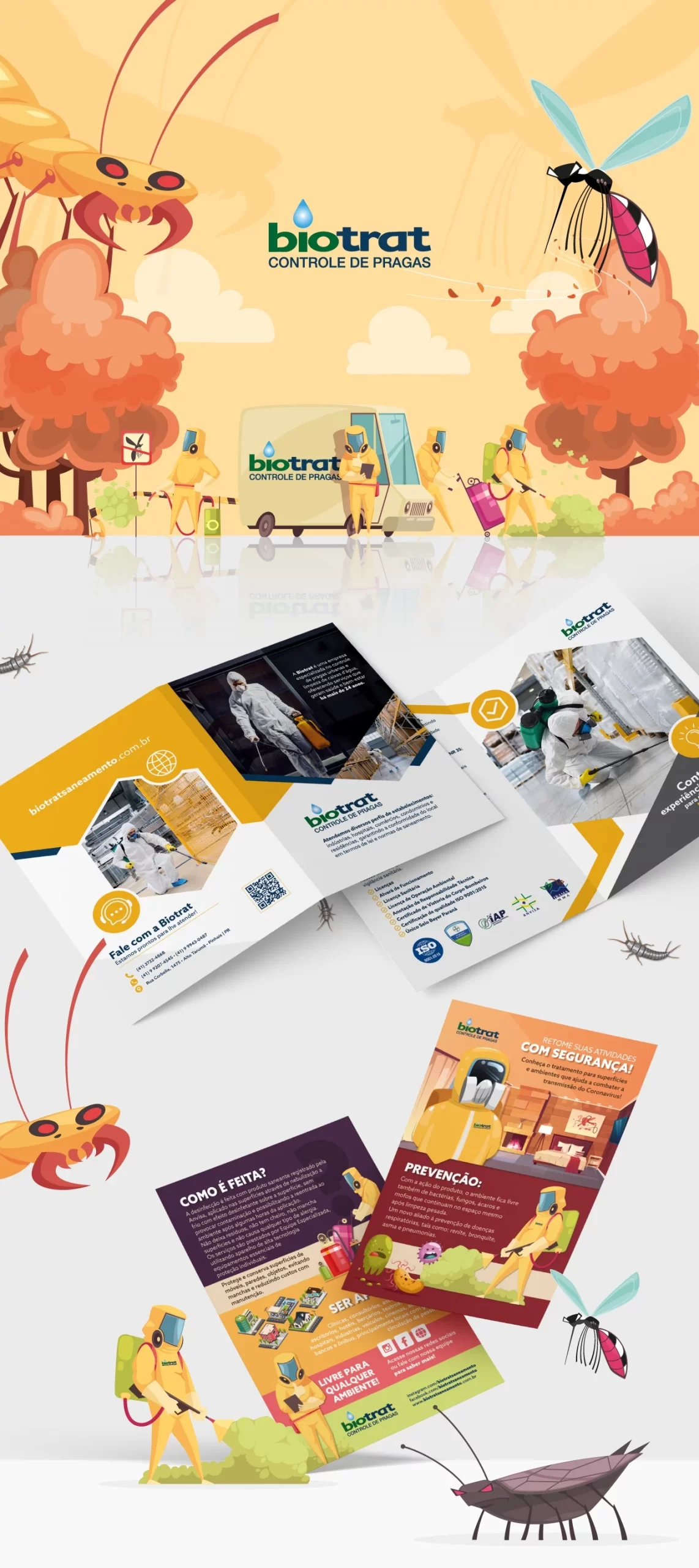 A Biotrat é uma empresa de controle de pragas e desinsetização que atua em Curitiba e região metropolitana. Com grande experiência no mercado, a empresa encontrava-se em um momento em que precisava inovar para ser reconhecida. Nossa missão foi criar uma identidade que a diferenciasse em meio a tantos outros concorrentes e gerasse reconhecimento de marca de maneira única. A partir disso, seus materiais seguem uma linha criativa exclusiva e sua forma de comunicação e tom de voz também foi reestruturado.